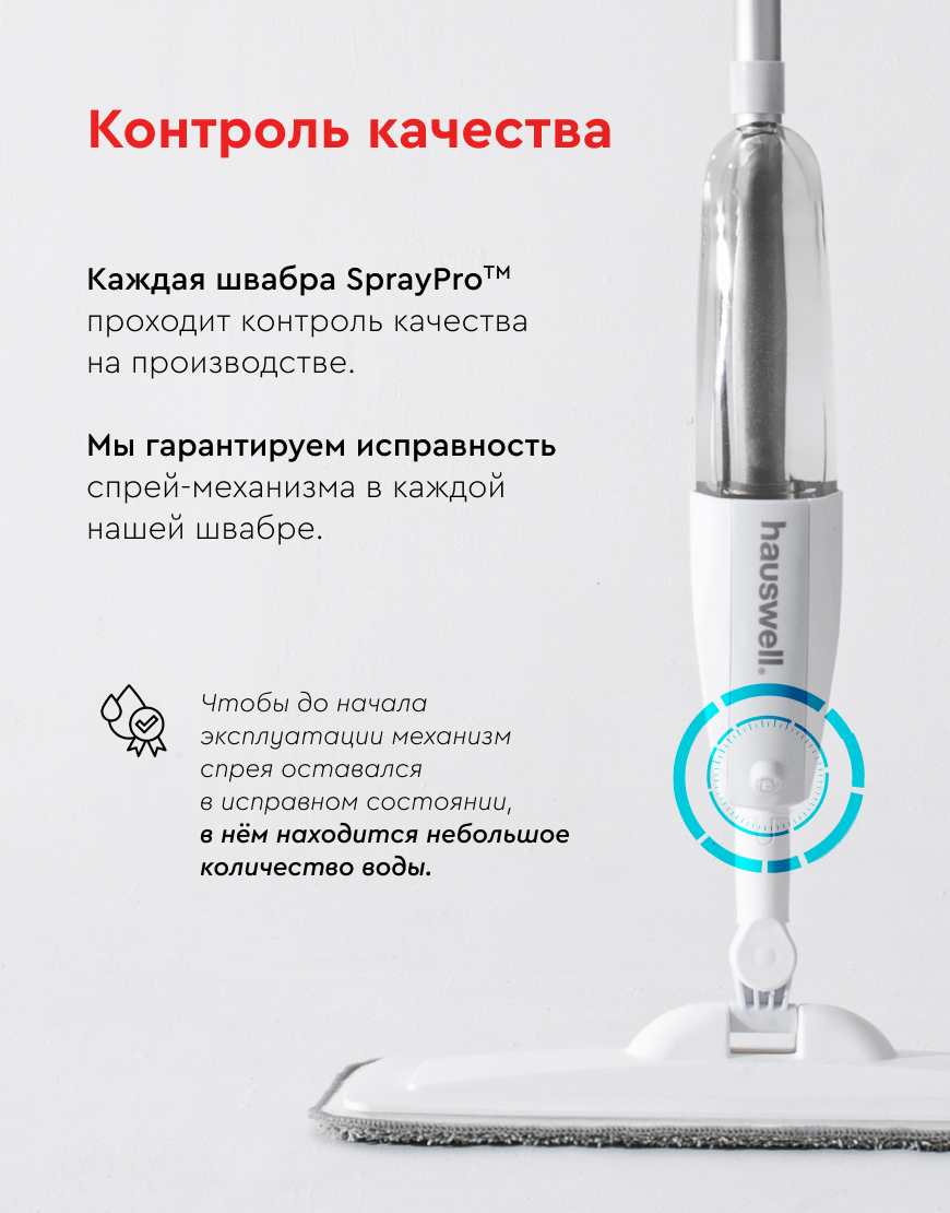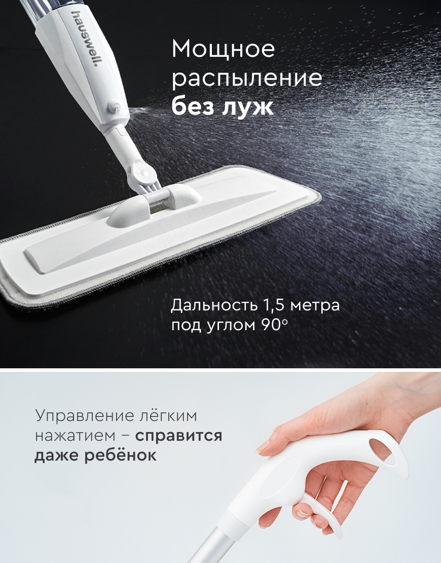Швабра с отжимом Hauswell разрабатывается в Европе для рынка Евразии с применением новейших технологий в производстве пластика и насадок из микрофибры Tri-Clean для тщательной уборки помещений, квартир и частных домов. Уже более 1 миллиона семей в России выбрали Швабры с отжимом компании Hauswell за последние 5 лет! Бренд Hauswell получил заслуженную популярность в России благодаря уникальному дизайну, высокопрочным материалам системы отжима и износостойким насадкам с высокотехнологичной микрофиброй Tri-Clean, которая впитывает и убирает все виды бытовых загрязнений. Гарантия 365 дней – это залог надежности и высокого качества нашей продукции! Швабра с распылителем модель SprayPro создана для быстрой ежедневной уборки дома без ведер и ползания на коленках. Смарт швабра для мытья пола и окон оснащена пластиковым баком объемом 360 мл, в который вы можете залить воду с моющим средством, поэтому не нужно носить за собой тяжелое ведро. Ручка сделана из металла – легкого алюминия с поролоновой насадкой, что обеспечивает ей простоту использования и маневренность. Механизм спрея позволяет регулировать количество воды на полу и обеспечивает широкий угол распыления. Размер насадки из микрофибры 41х14 см, в отличии от обычной тряпки, микрофибра эффективно собирает пыль, шерсть и волосы. Насадки можно стирать в стиральной машине при щадящих режимах (30-40 градусов и низких оборотах, без применения отбеливающих средств). Насадки рекомендуется менять каждые 3 месяца. Умная бытовая швабра с распылителем воды станет незаменимым помощником в уборке, ведь использовать её можно не только для мойки ламината, паркета, плитки, чистки стен и потолка в доме, но и в качестве окномойки.